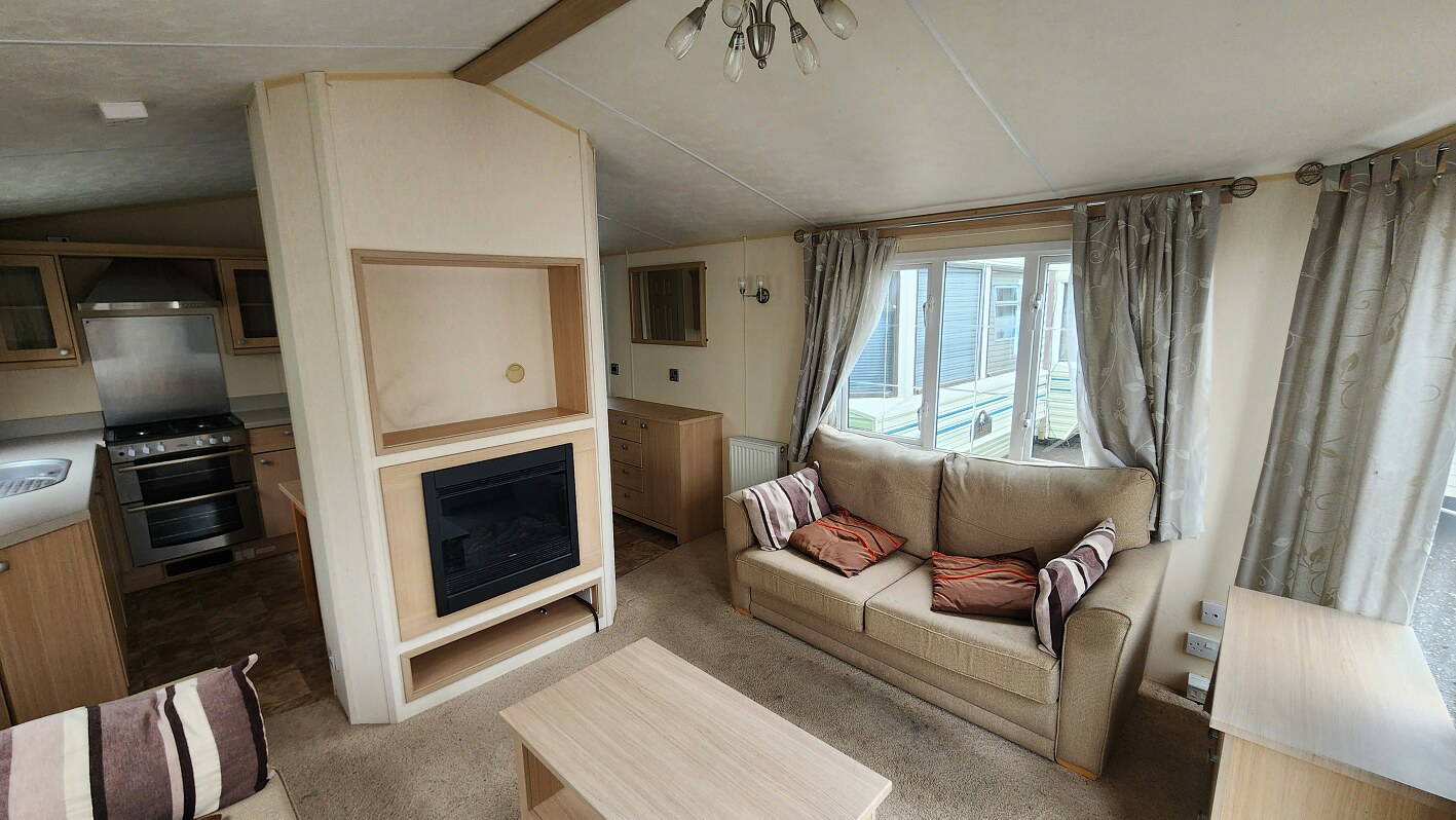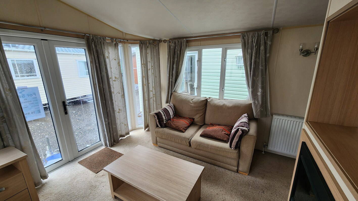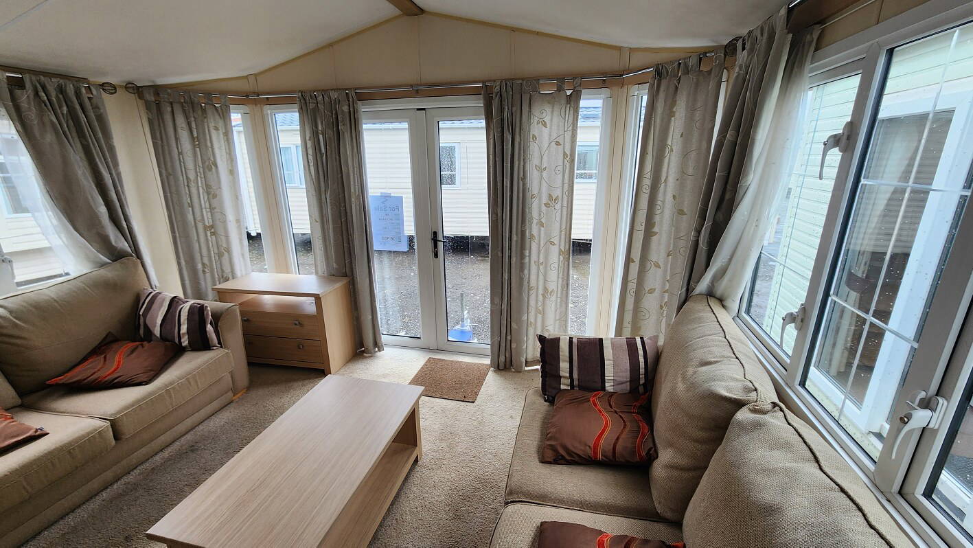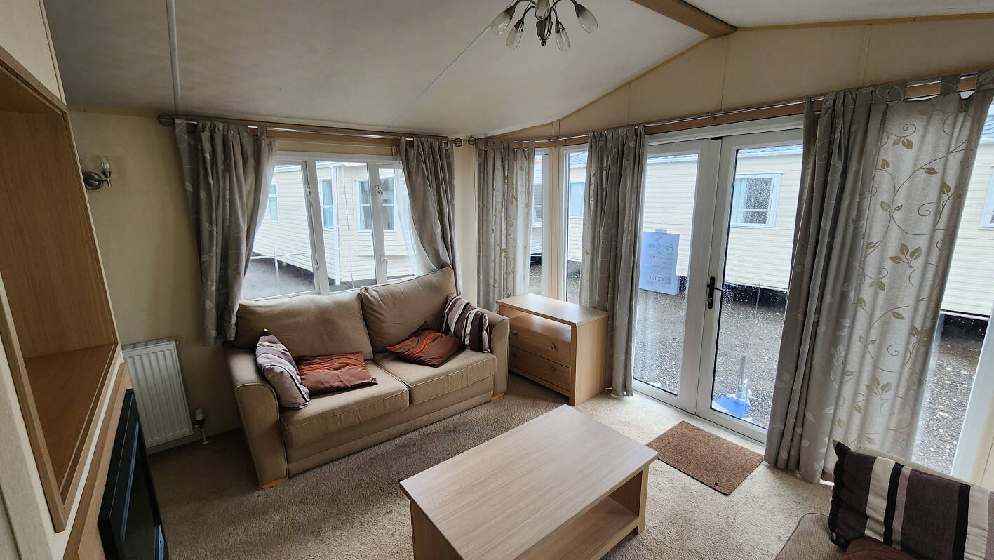 BK Sheraton 38’x12′ two bedrooms. Master bedroom double bed and ensuite toilet. Second bedroom with twin beds. WC and shower room. Double glazing & central heating. LPG combination boiler, cooker and lounge fire. Stock no.8