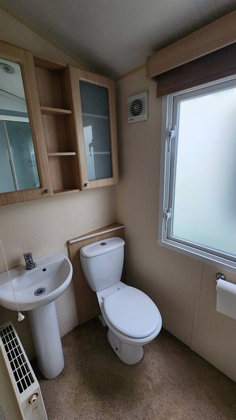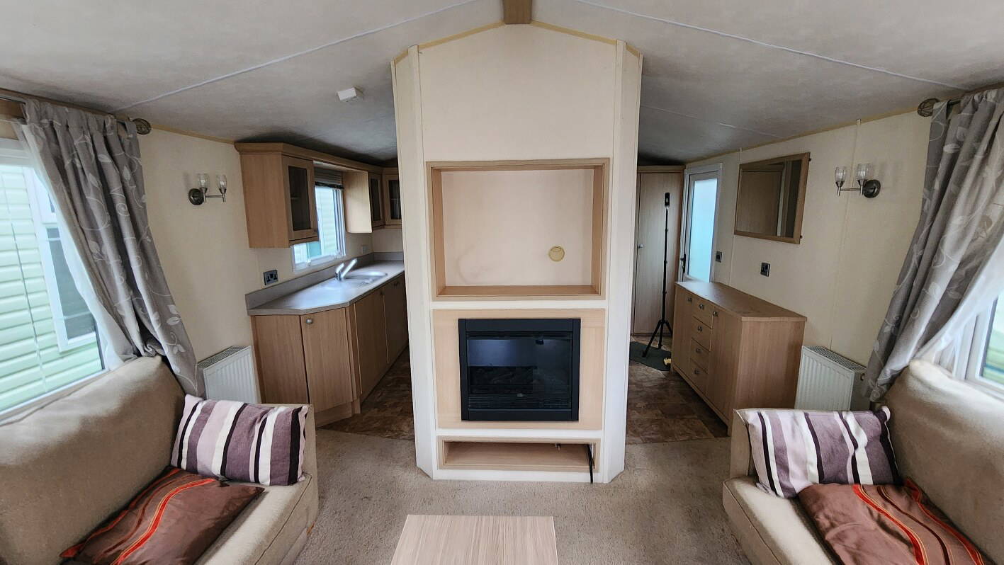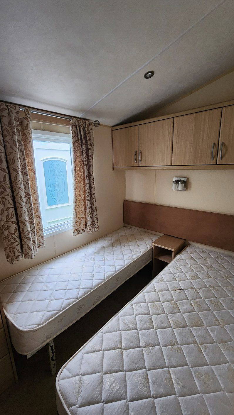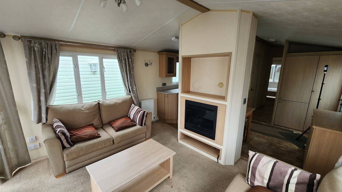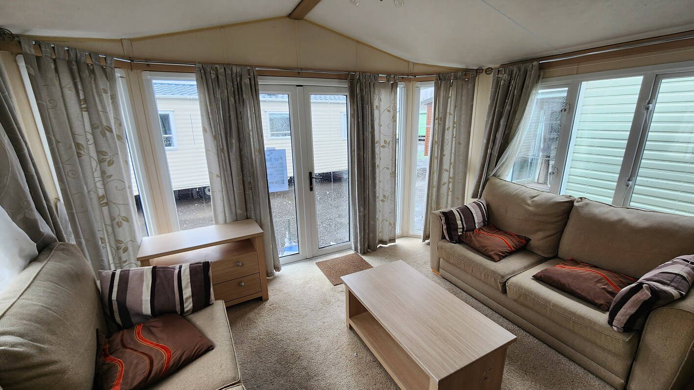 BK Sheraton 38’x12′ two bedrooms. Master bedroom double bed and ensuite toilet. Second bedroom with twin beds. WC and shower room. Double glazing & central heating. LPG combination boiler, cooker and lounge fire. Stock no.8