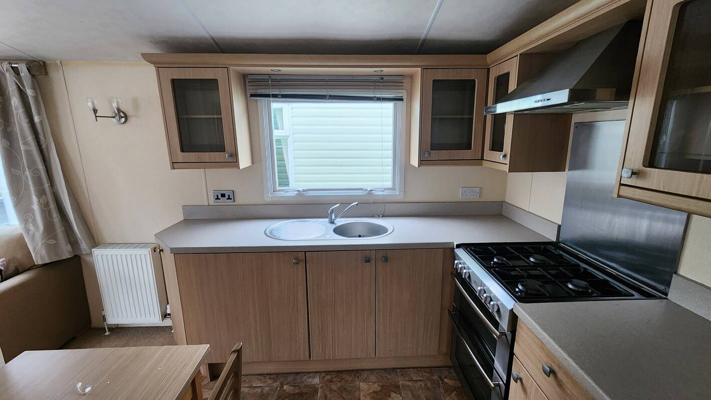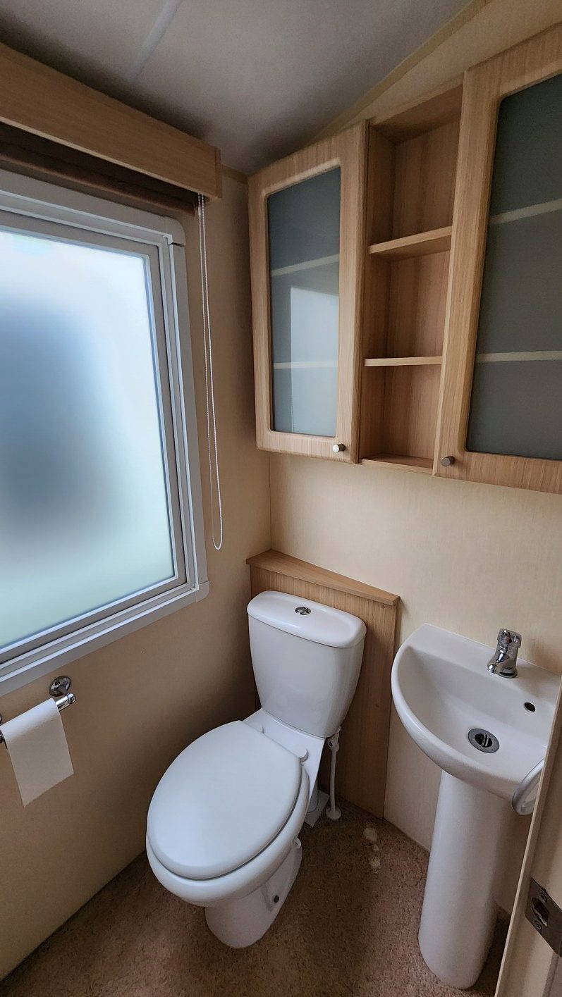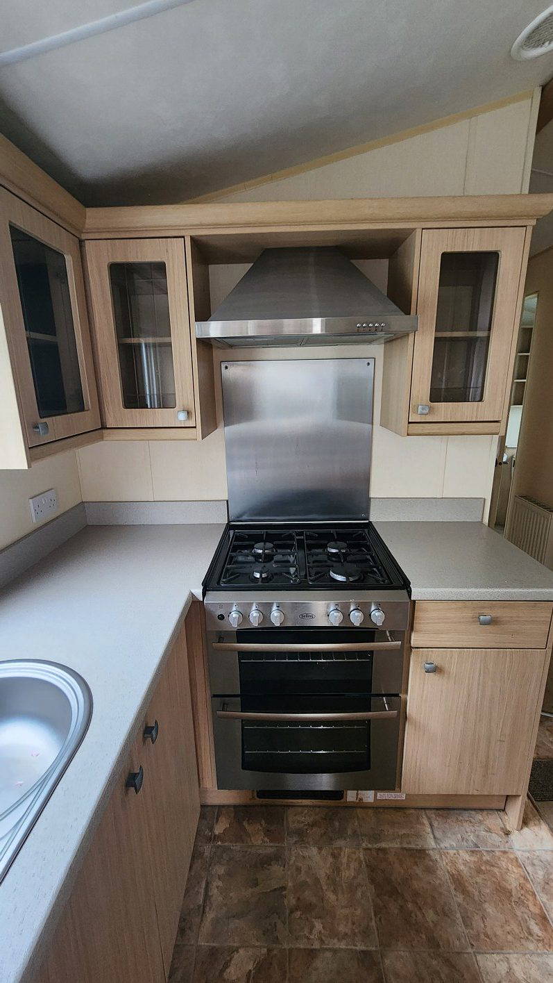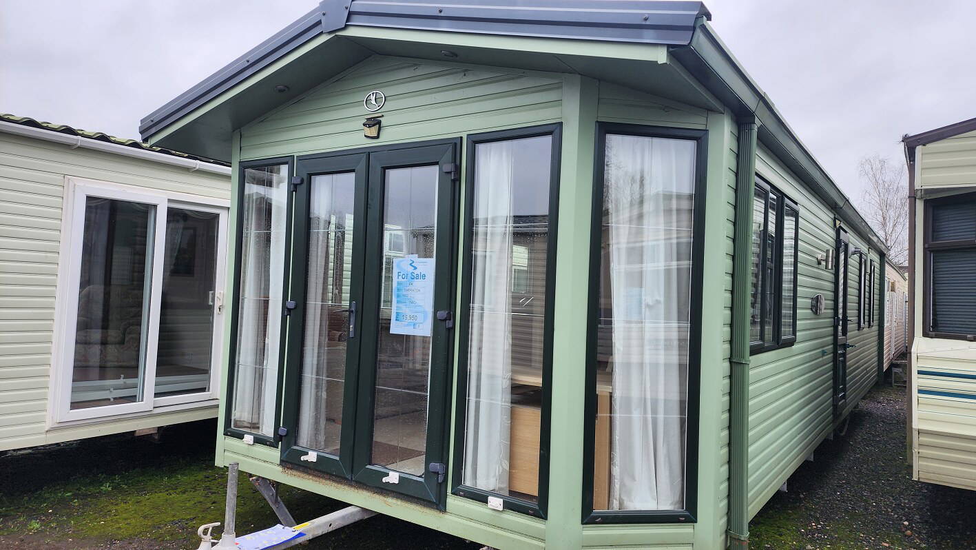 BK Sheraton 38’x12′ two bedrooms. Master bedroom double bed and ensuite toilet. Second bedroom with twin beds. WC and shower room. Double glazing & central heating. LPG combination boiler, cooker and lounge fire. Stock no.8