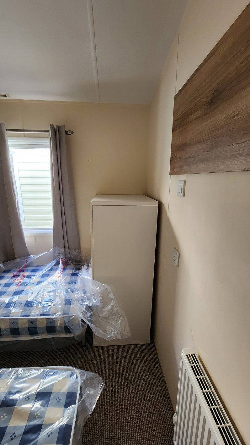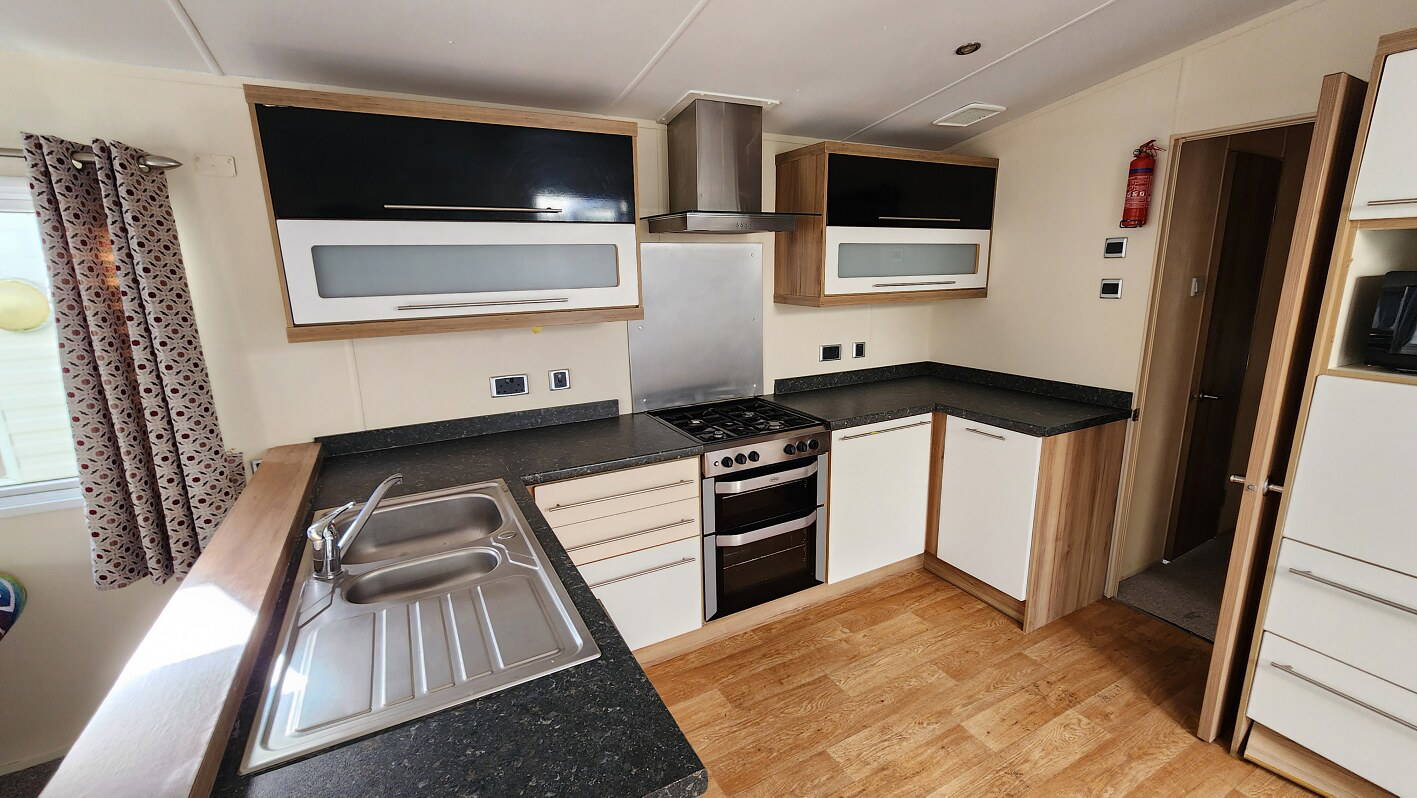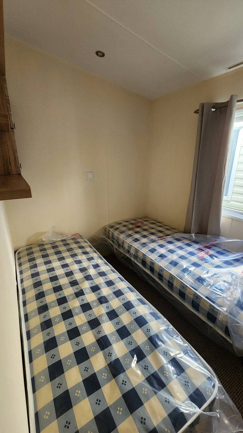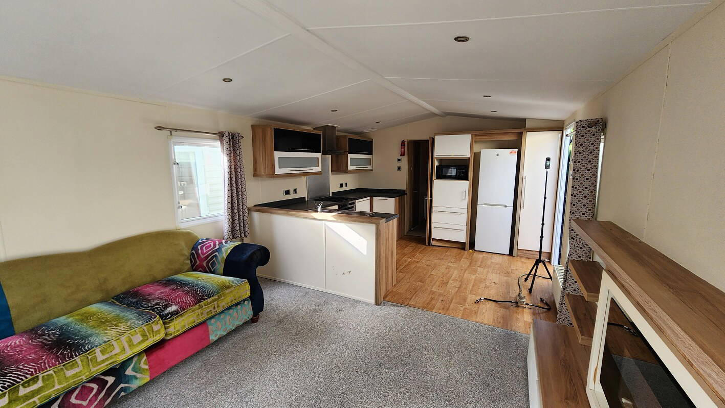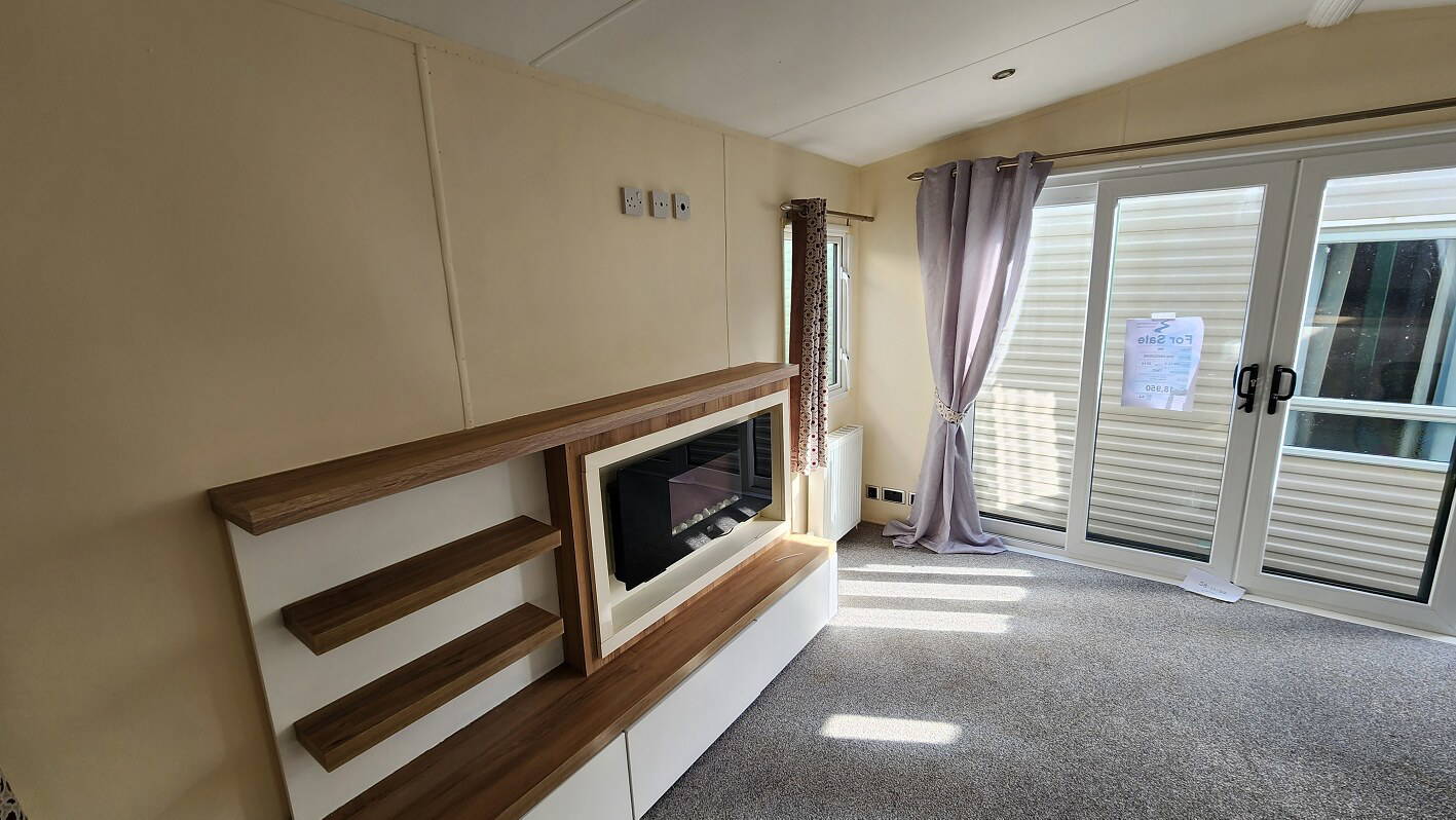 2014 BK Sherborne 39’x12’6″ two bedrooms. Master bedroom double bed and ensuite WC and shower. Second bedroom with twin beds. WC and shower room. Double glazing & central heating. LPG combination boiler, cooker and electric lounge fire. Stock no.44
