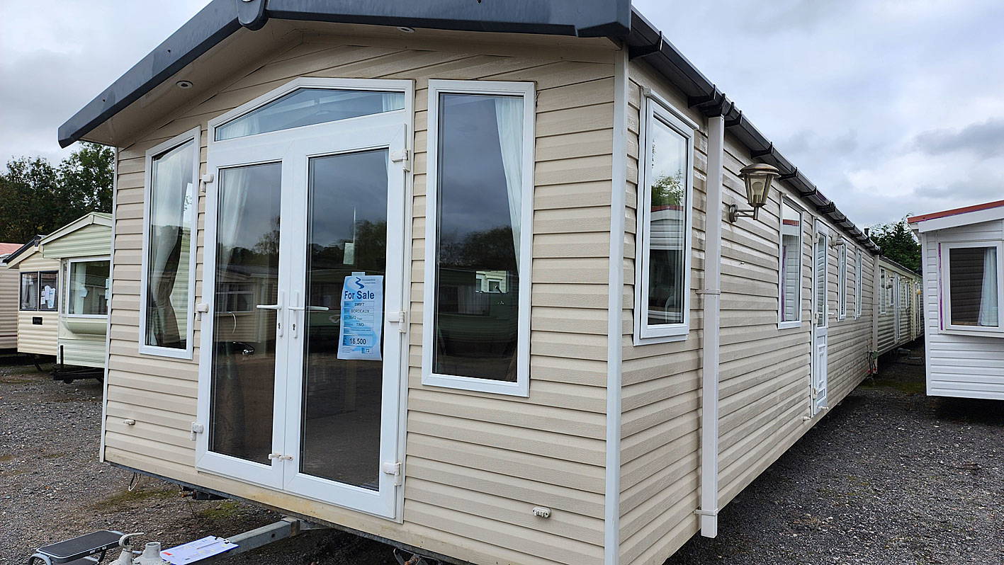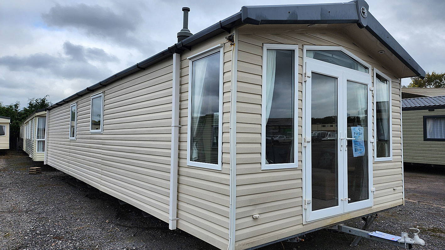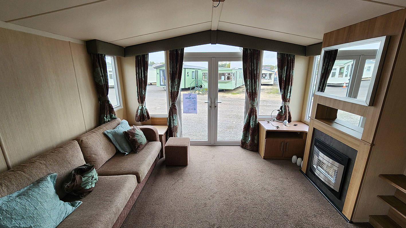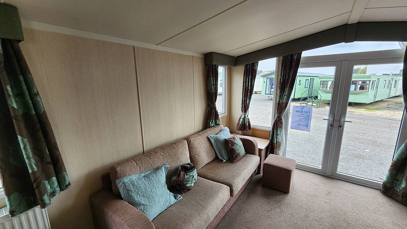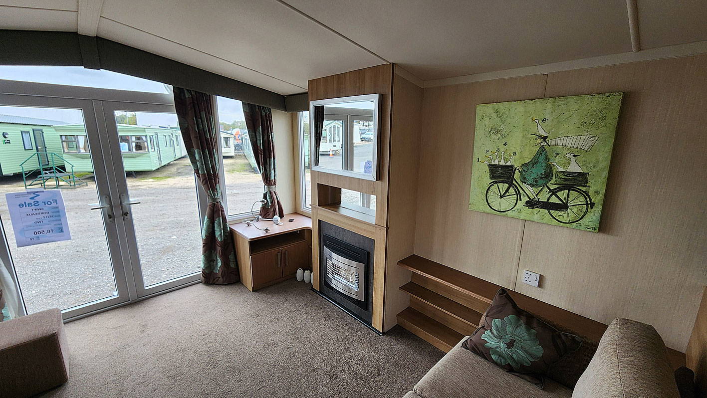 Swift Bordeaux 38’x12′ two bedrooms. Master bedroom double bed and ensuite WC. Second bedroom with twin beds. WC and shower room. Double glazing and central heating. LPG boiler and cooker, and electric lounge fire. Stock no.72
