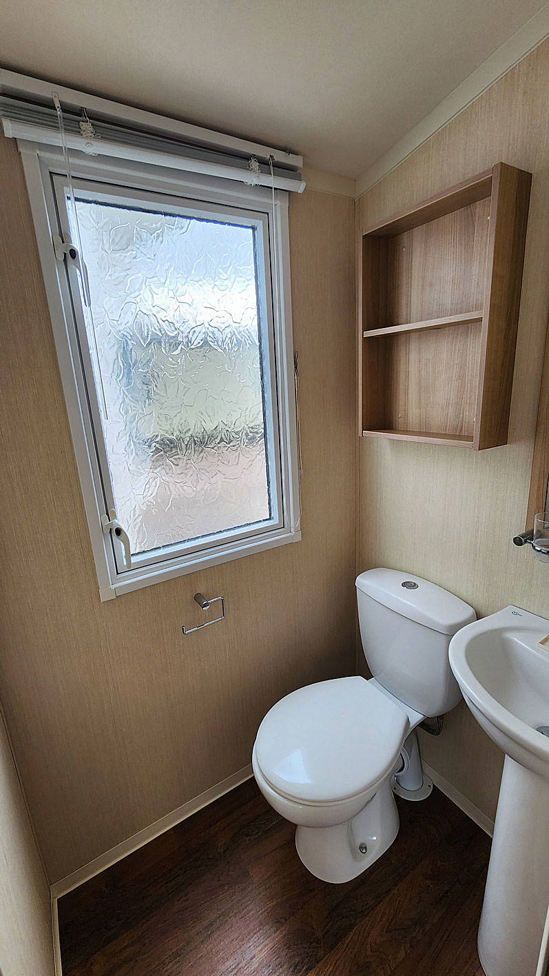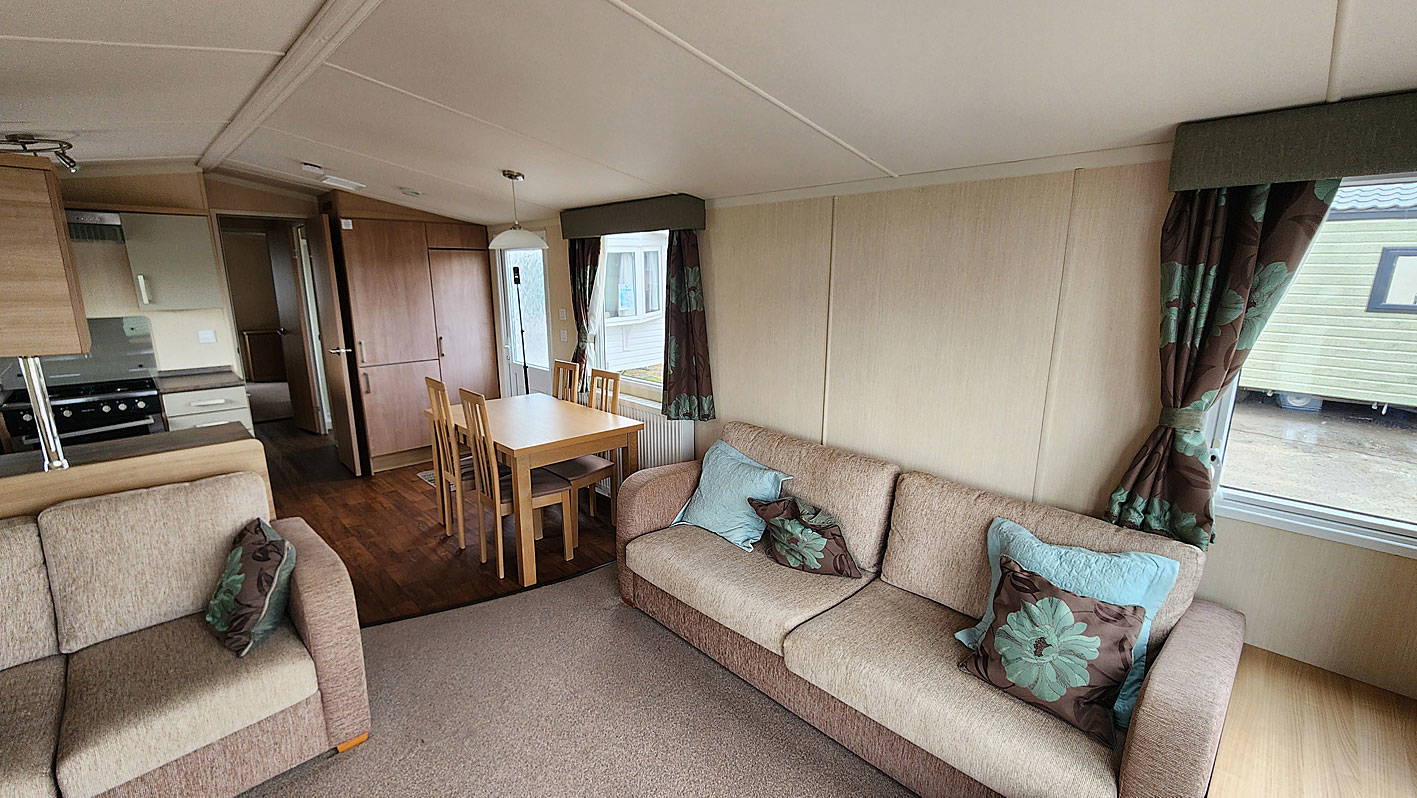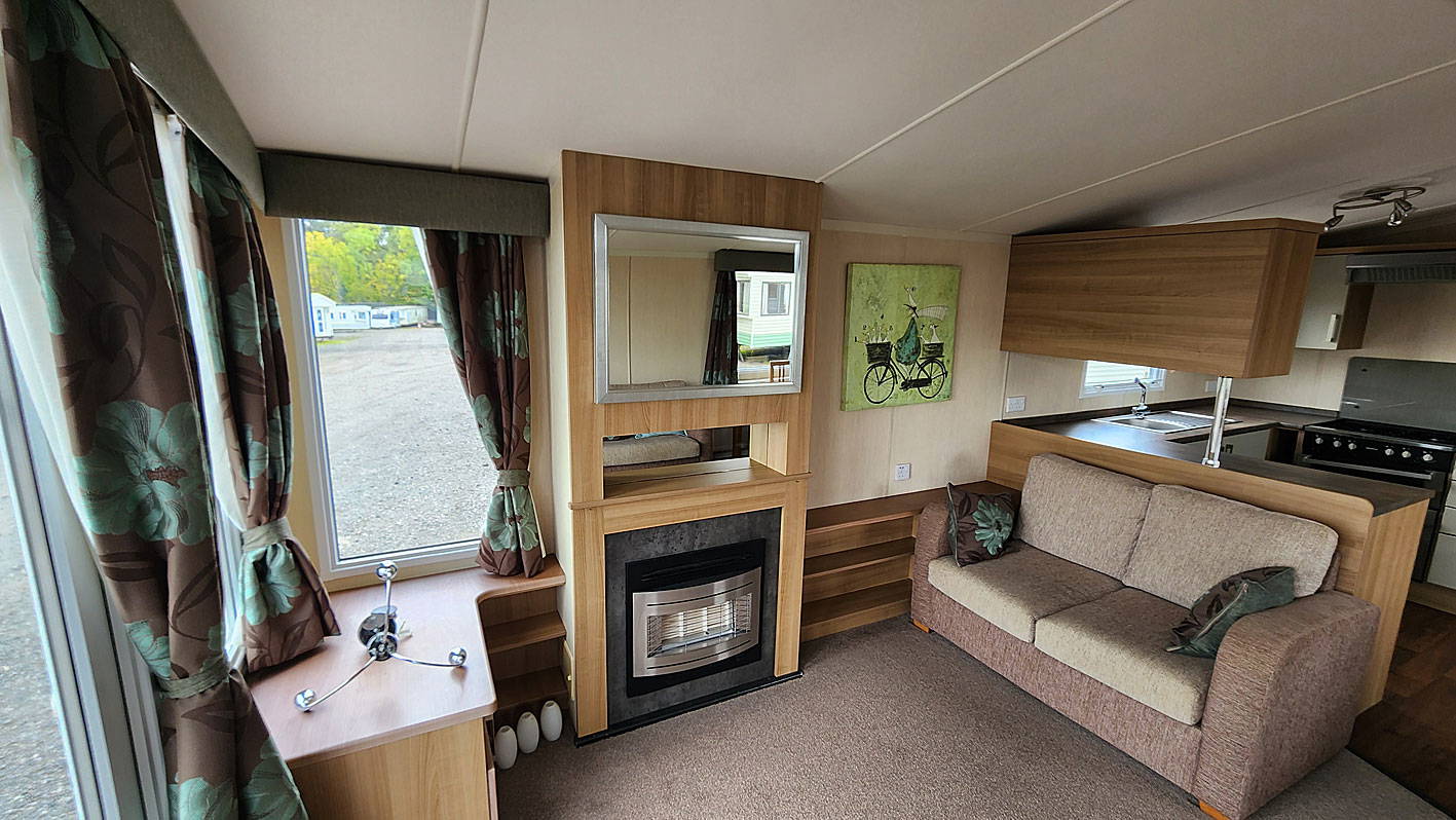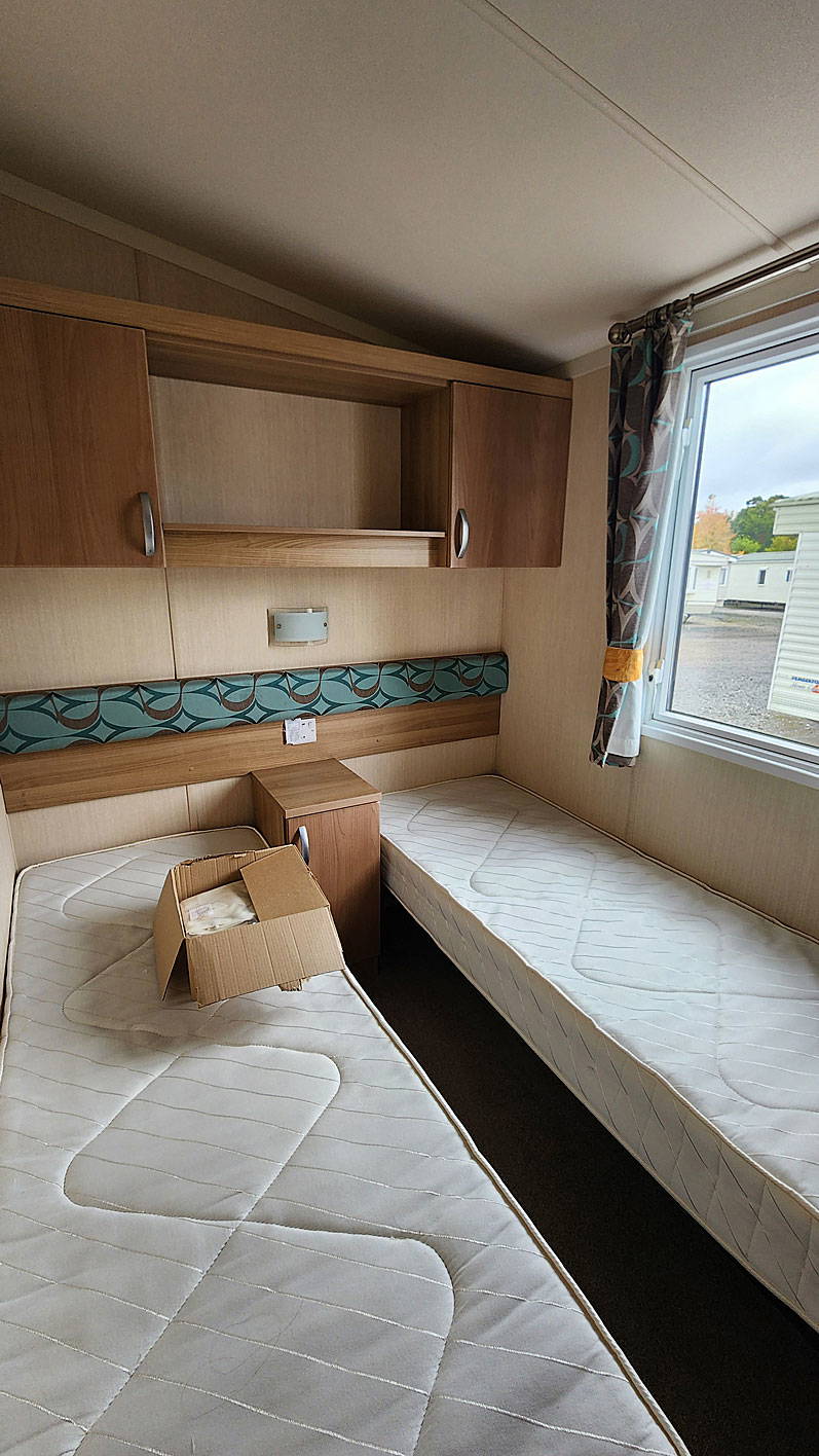 Swift Bordeaux 38’x12′ two bedrooms. Master bedroom double bed and ensuite WC. Second bedroom with twin beds. WC and shower room. Double glazing and central heating. LPG boiler and cooker, and electric lounge fire. Stock no.72
