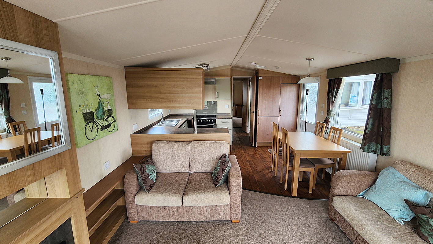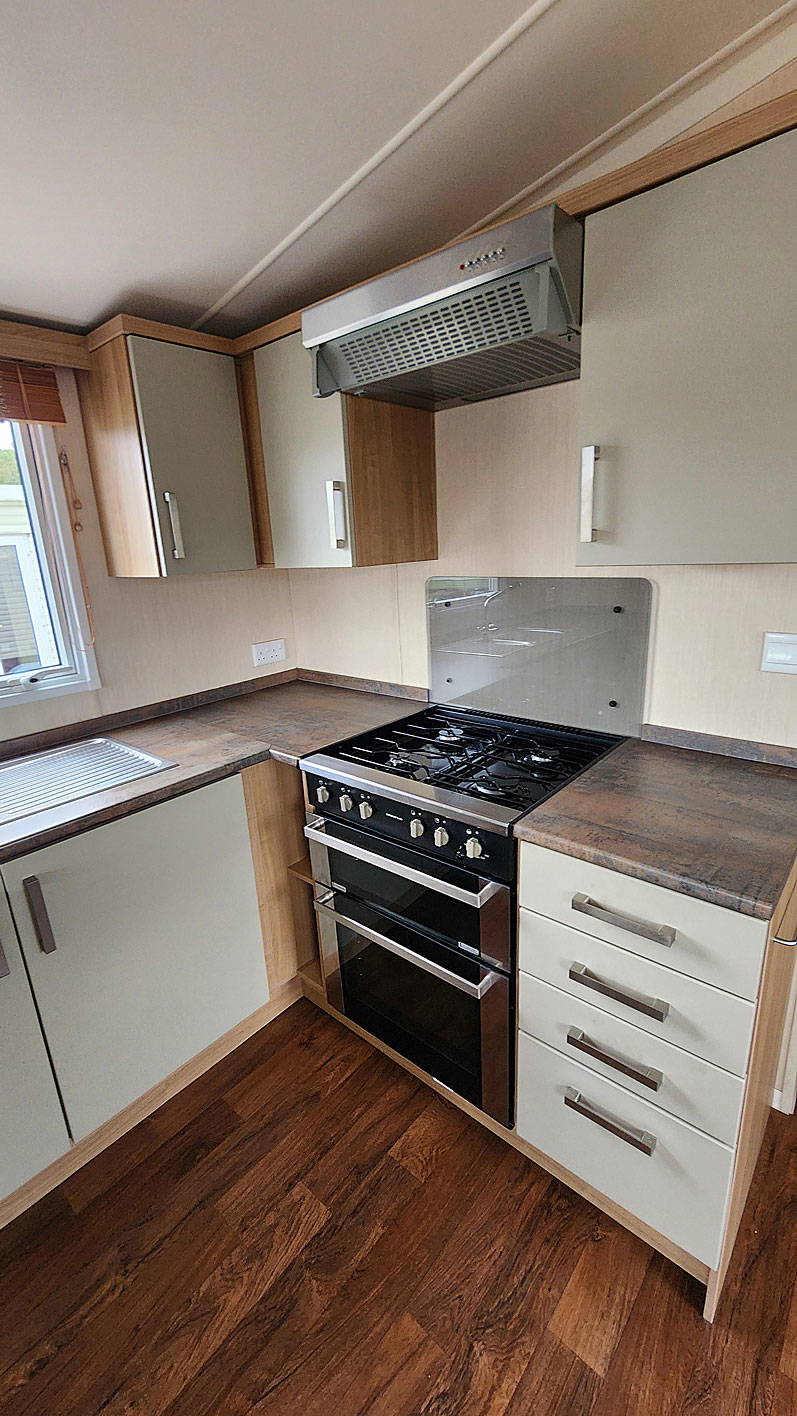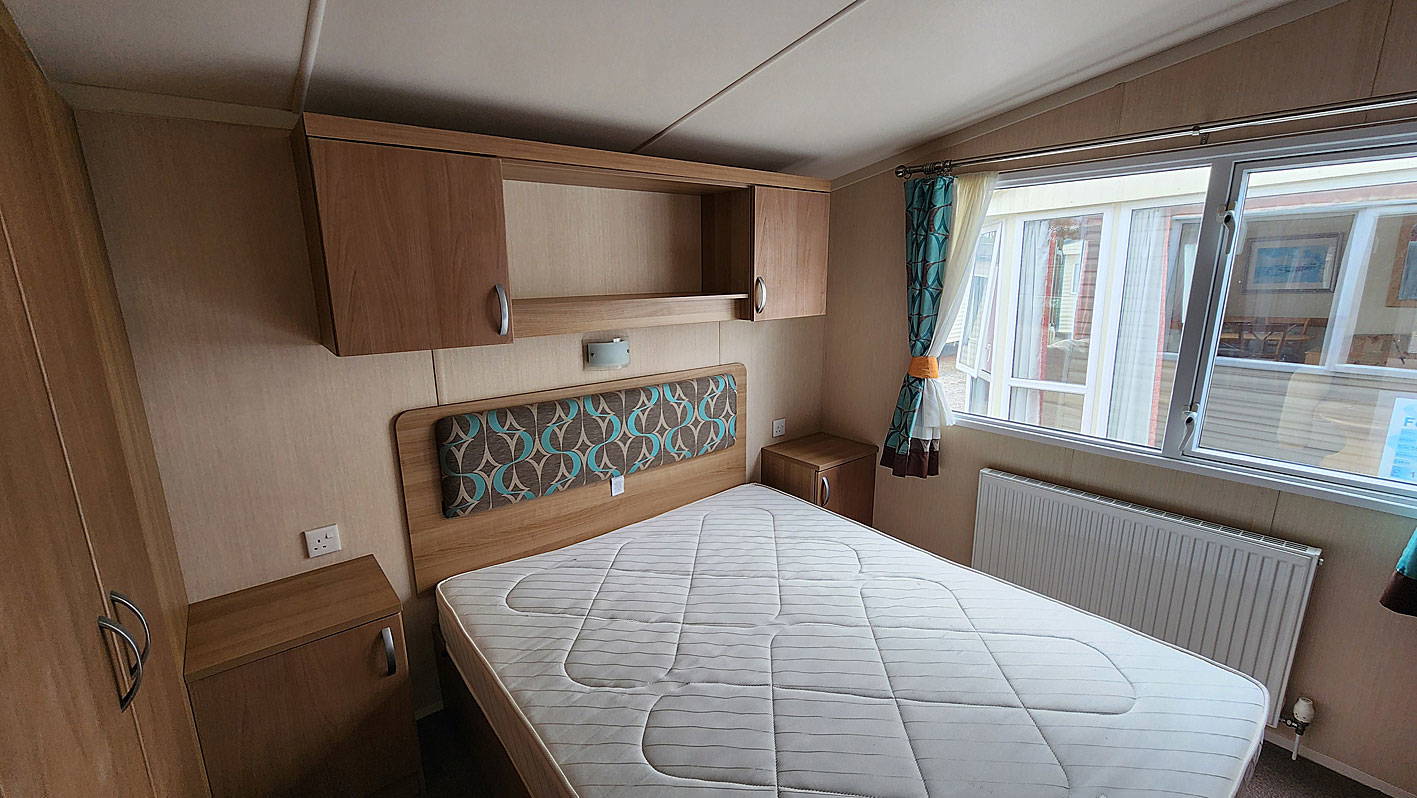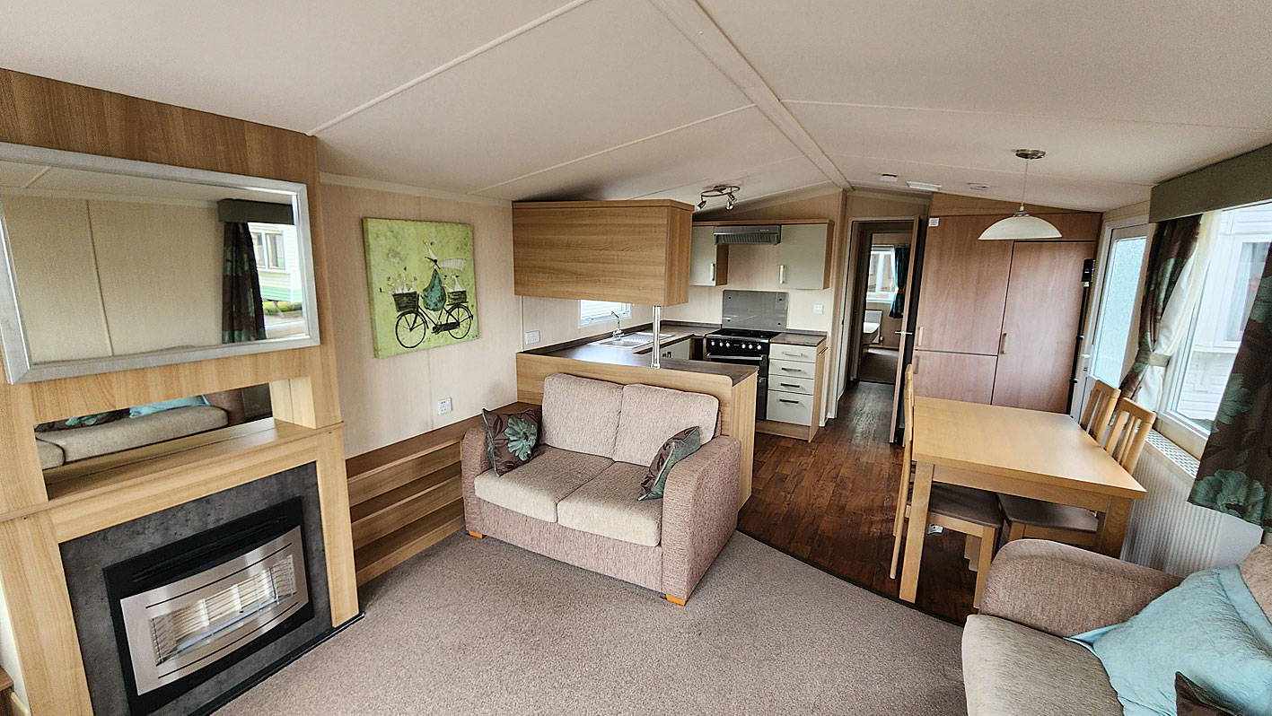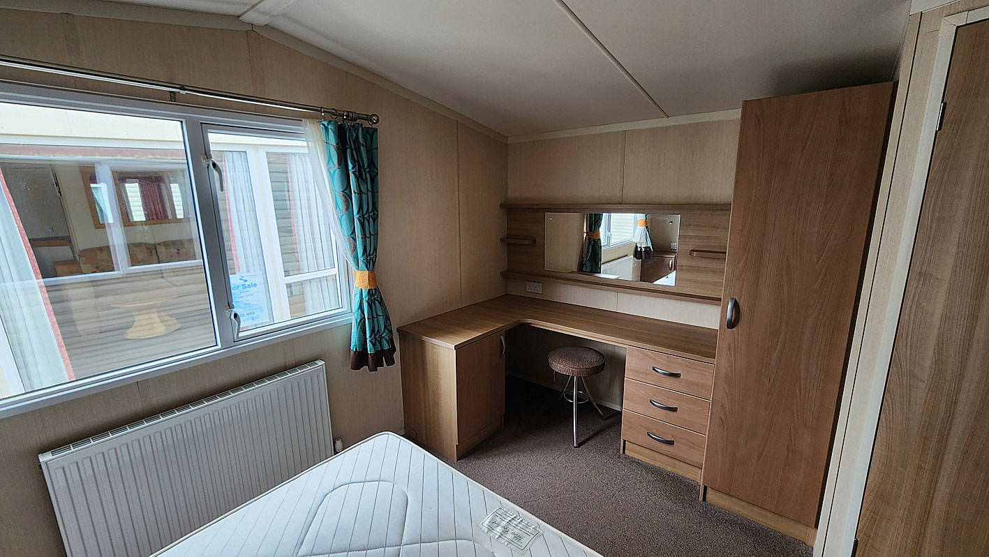 Swift Bordeaux 38’x12′ two bedrooms. Master bedroom double bed and ensuite WC. Second bedroom with twin beds. WC and shower room. Double glazing and central heating. LPG boiler and cooker, and electric lounge fire. Stock no.72
