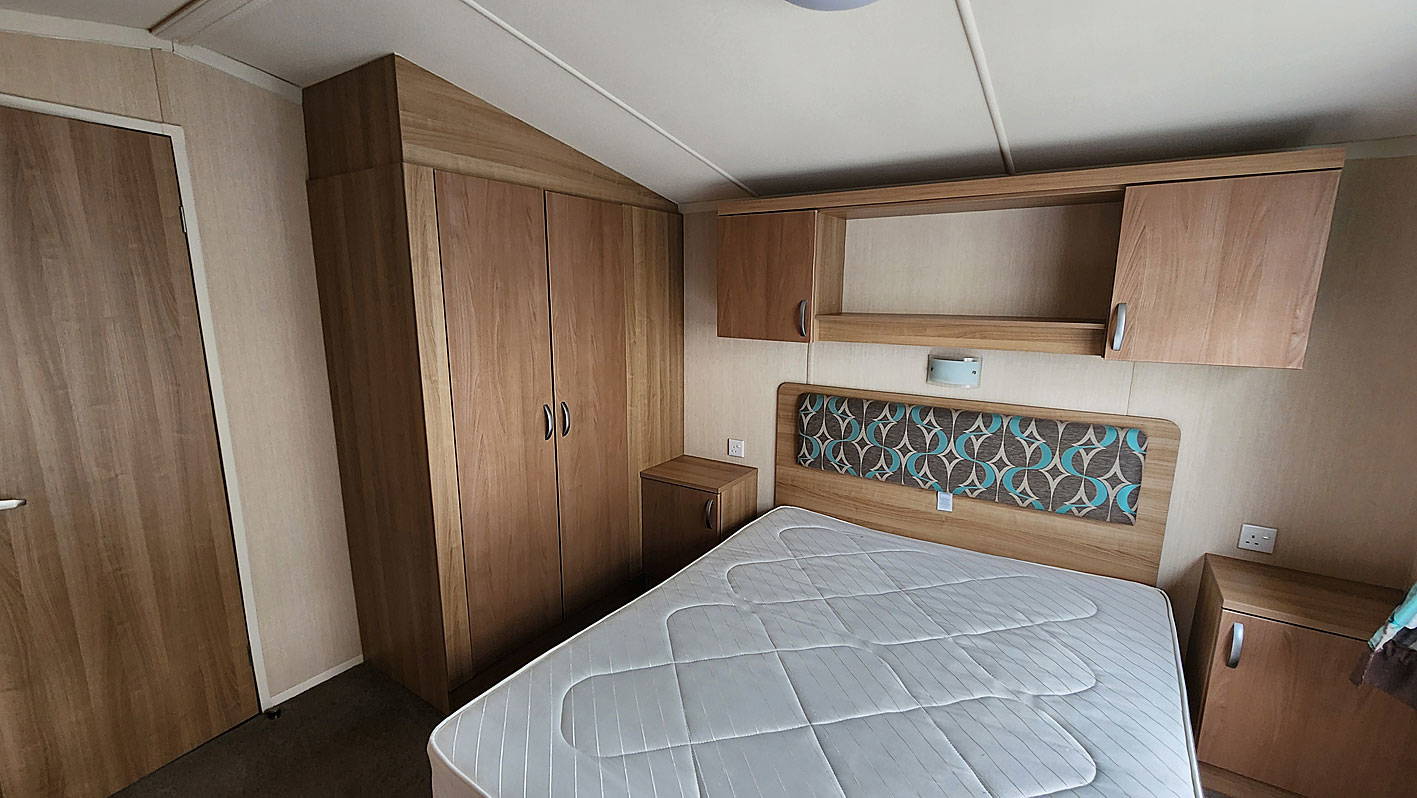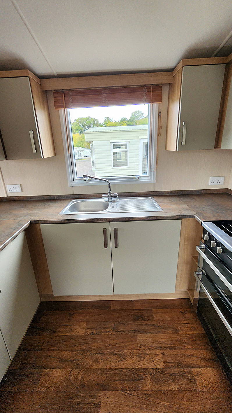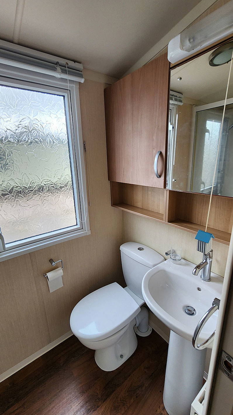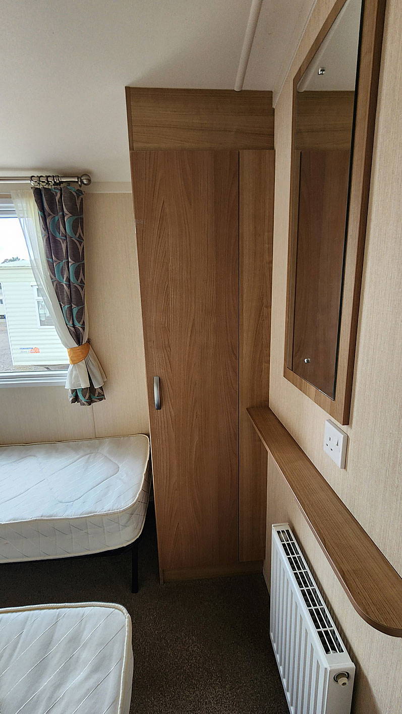 Swift Bordeaux 38’x12′ two bedrooms. Master bedroom double bed and ensuite WC. Second bedroom with twin beds. WC and shower room. Double glazing and central heating. LPG boiler and cooker, and electric lounge fire. Stock no.72