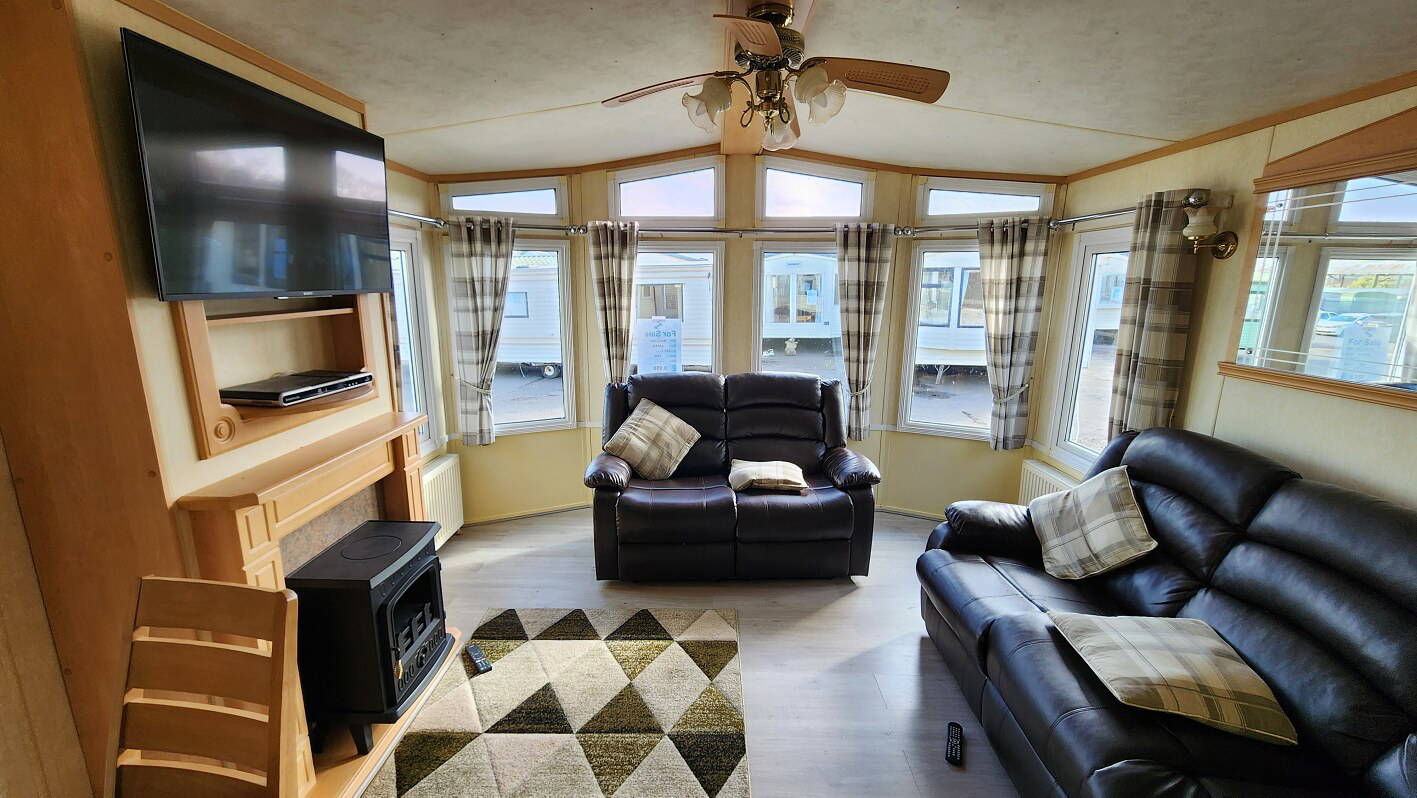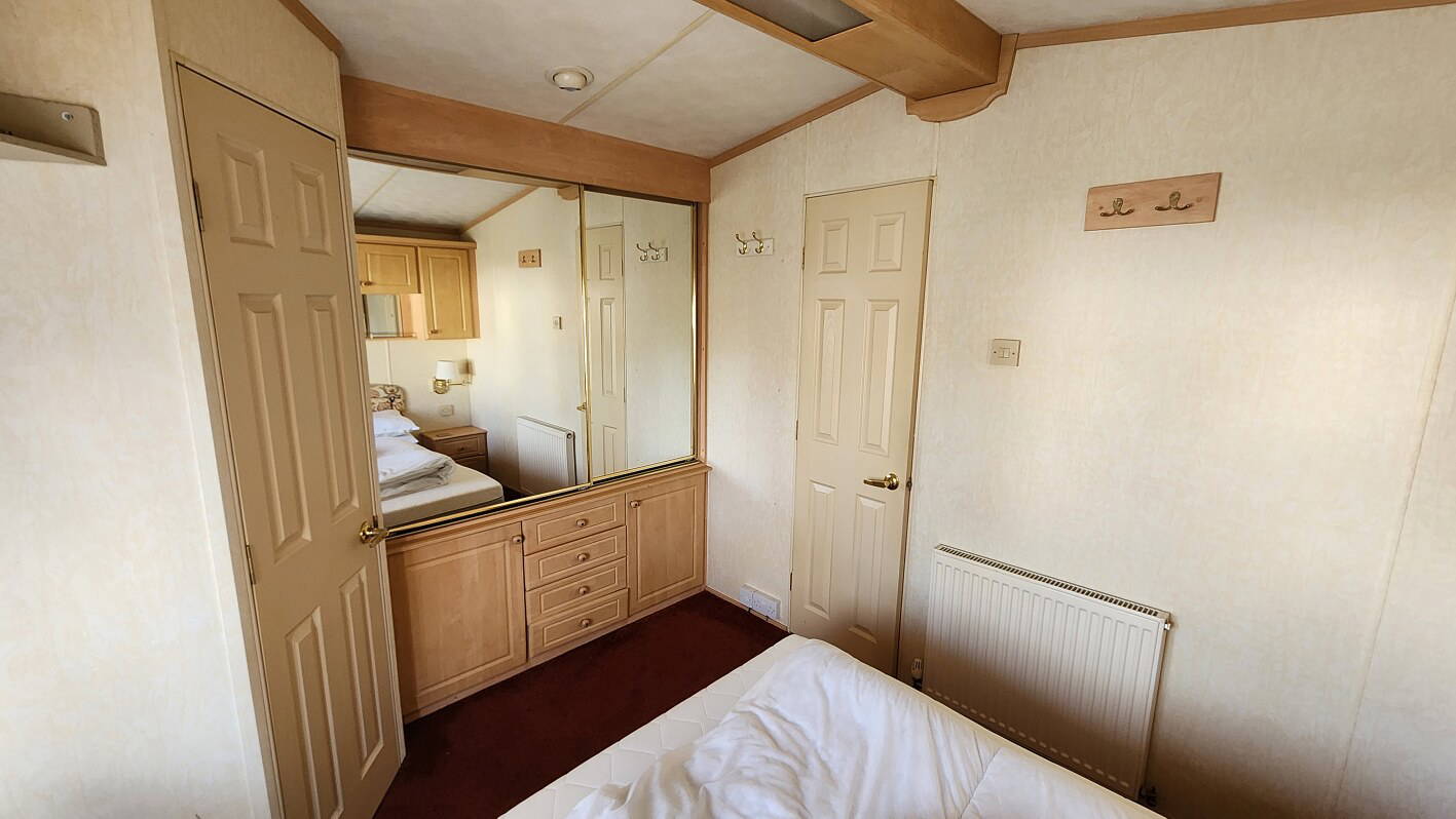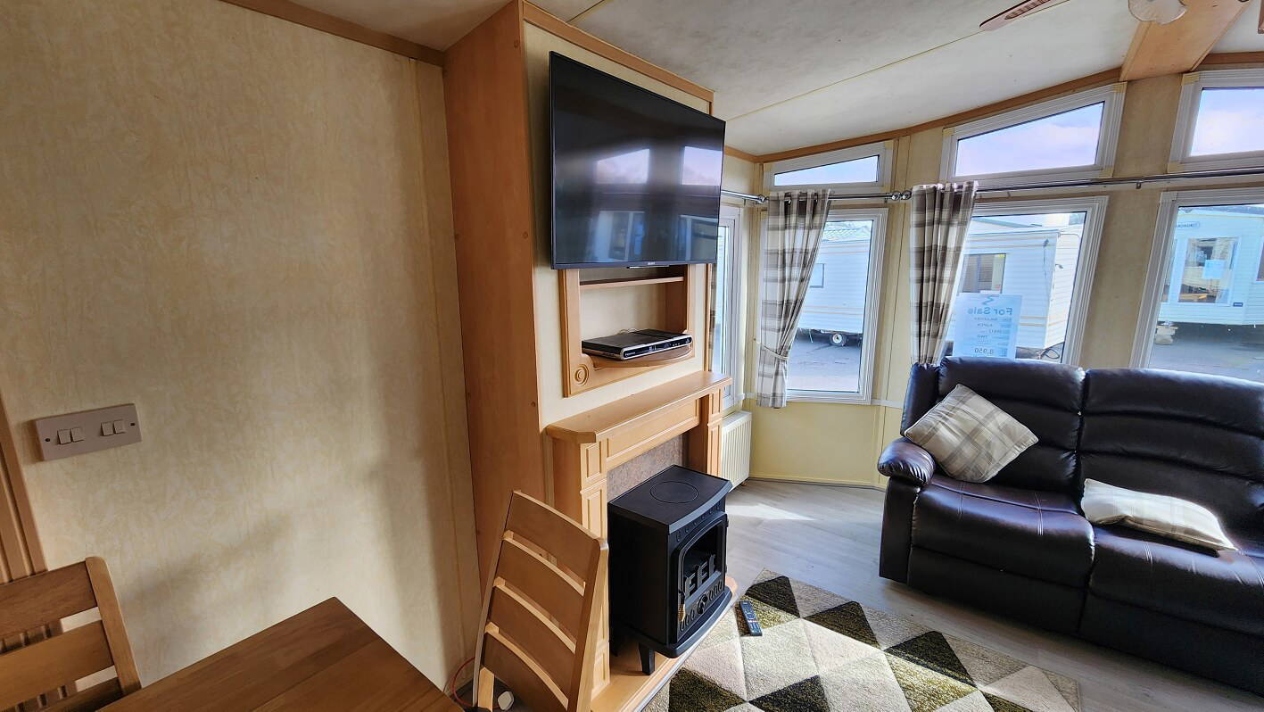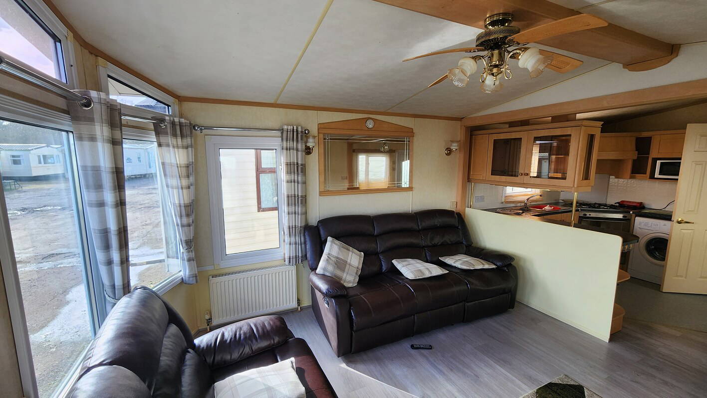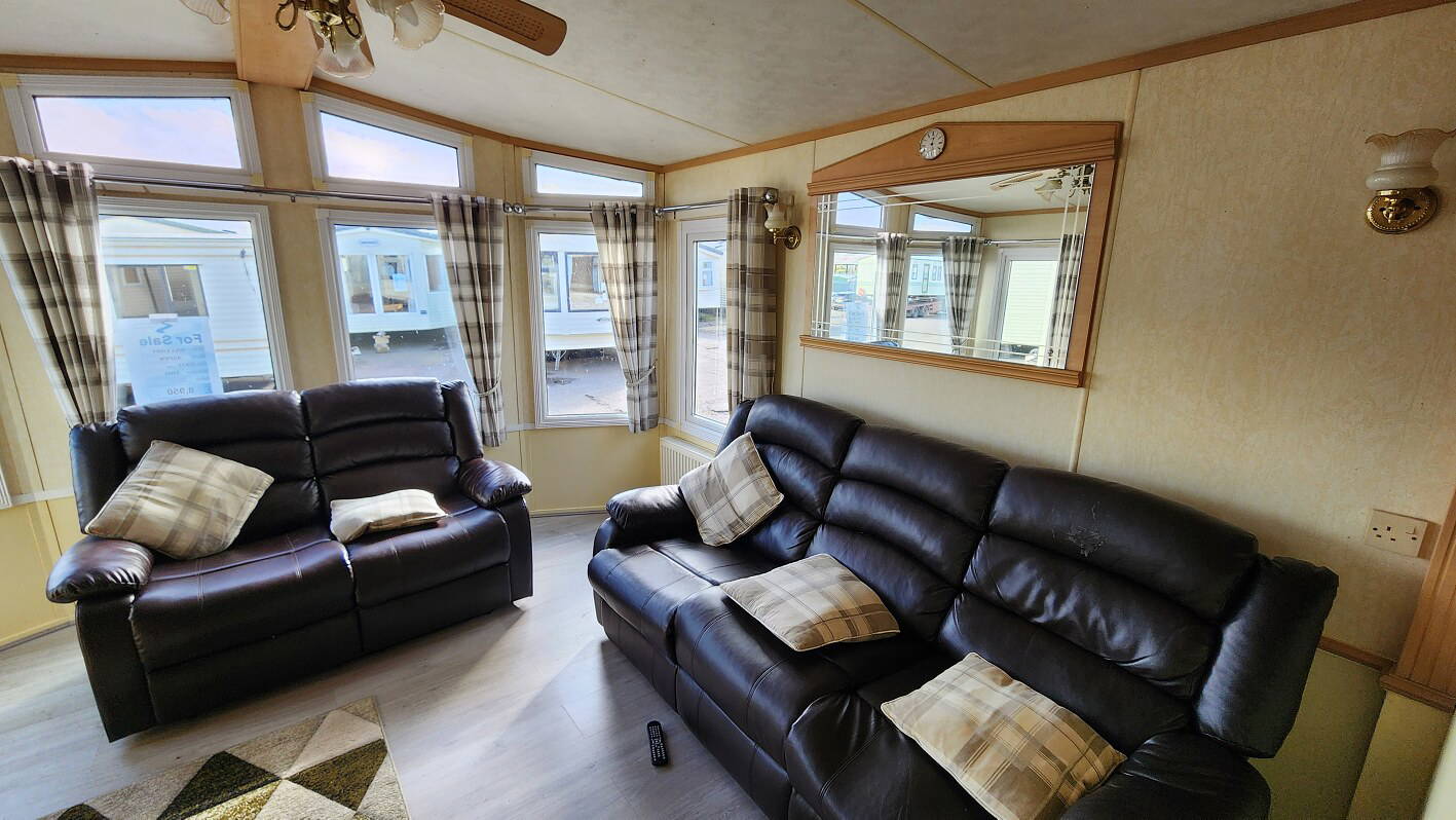 Willerby Aspen 35’x12′ two bedrooms. Master bedroom double bed with ensuite WC. Second bedroom with twin beds. WC and shower room. Double glazing and central heating. LPG water heater, cooker and lounge fire. Stock no.126