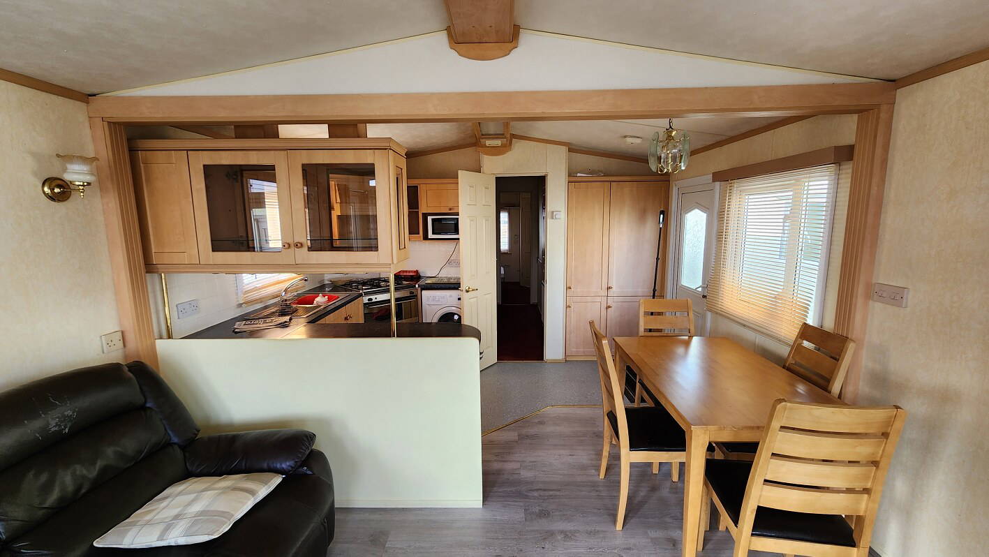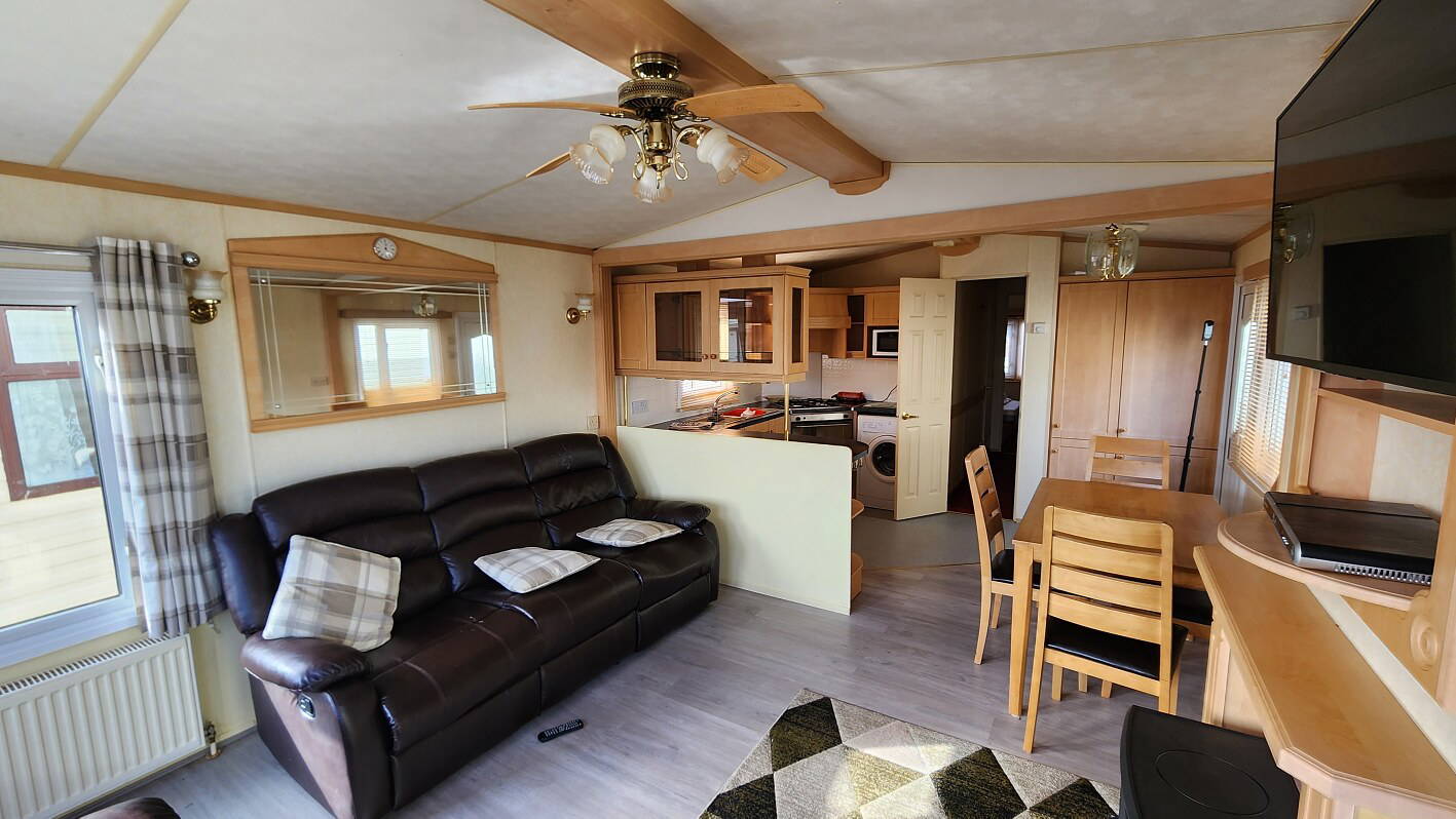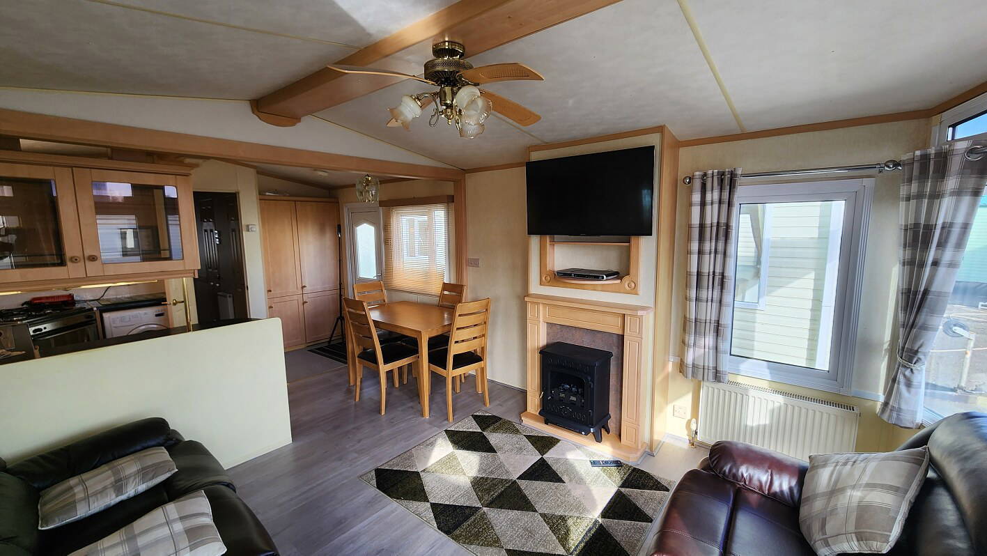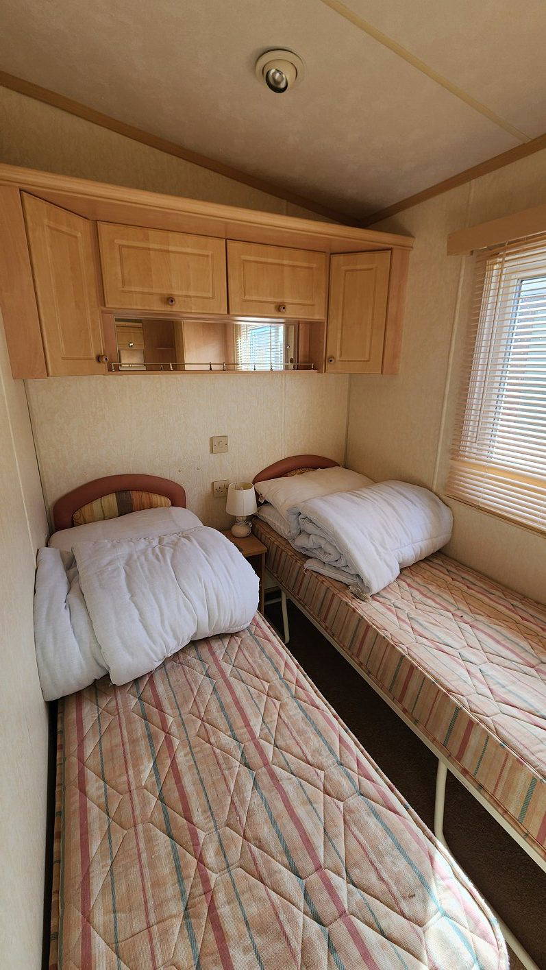 Willerby Aspen 35’x12′ two bedrooms. Master bedroom double bed with ensuite WC. Second bedroom with twin beds. WC and shower room. Double glazing and central heating. LPG water heater, cooker and lounge fire. Stock no.126