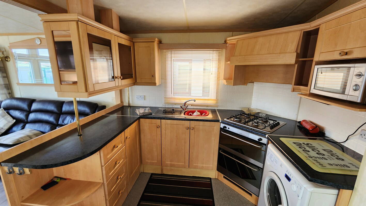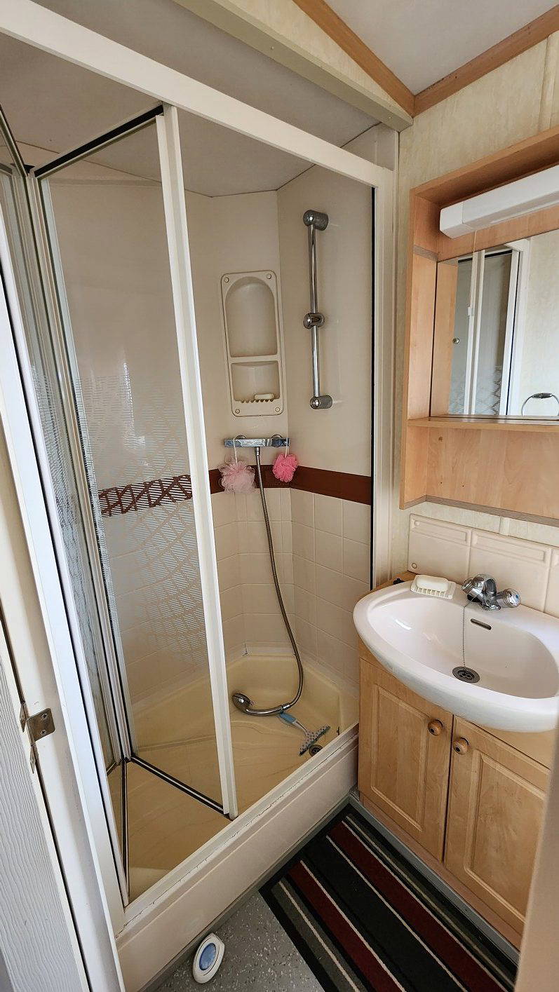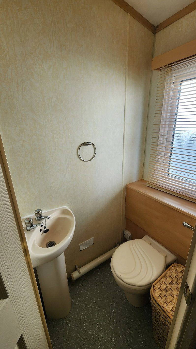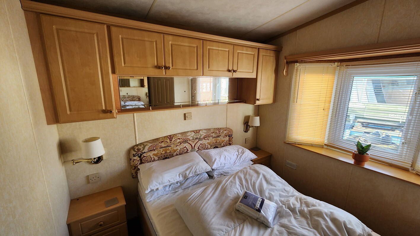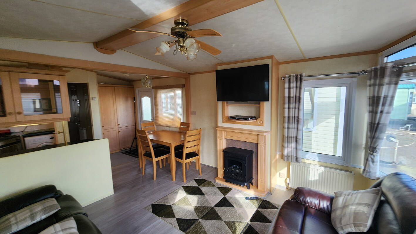 Willerby Aspen 35’x12′ two bedrooms. Master bedroom double bed with ensuite WC. Second bedroom with twin beds. WC and shower room. Double glazing and central heating. LPG water heater, cooker and lounge fire. Stock no.126