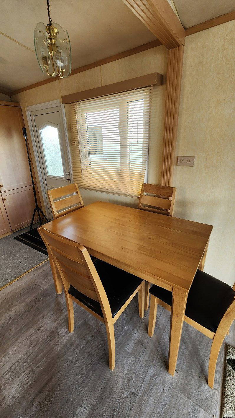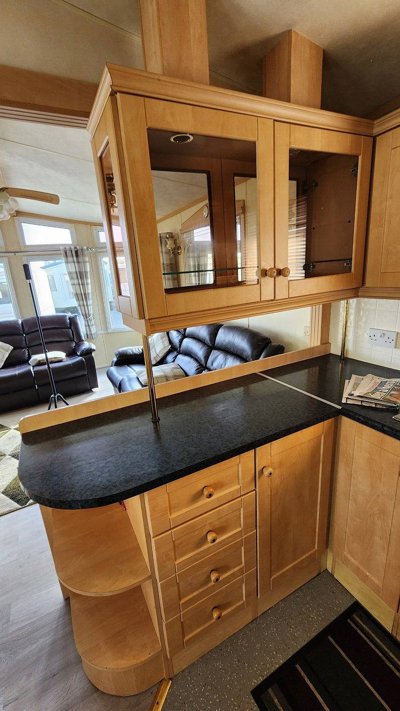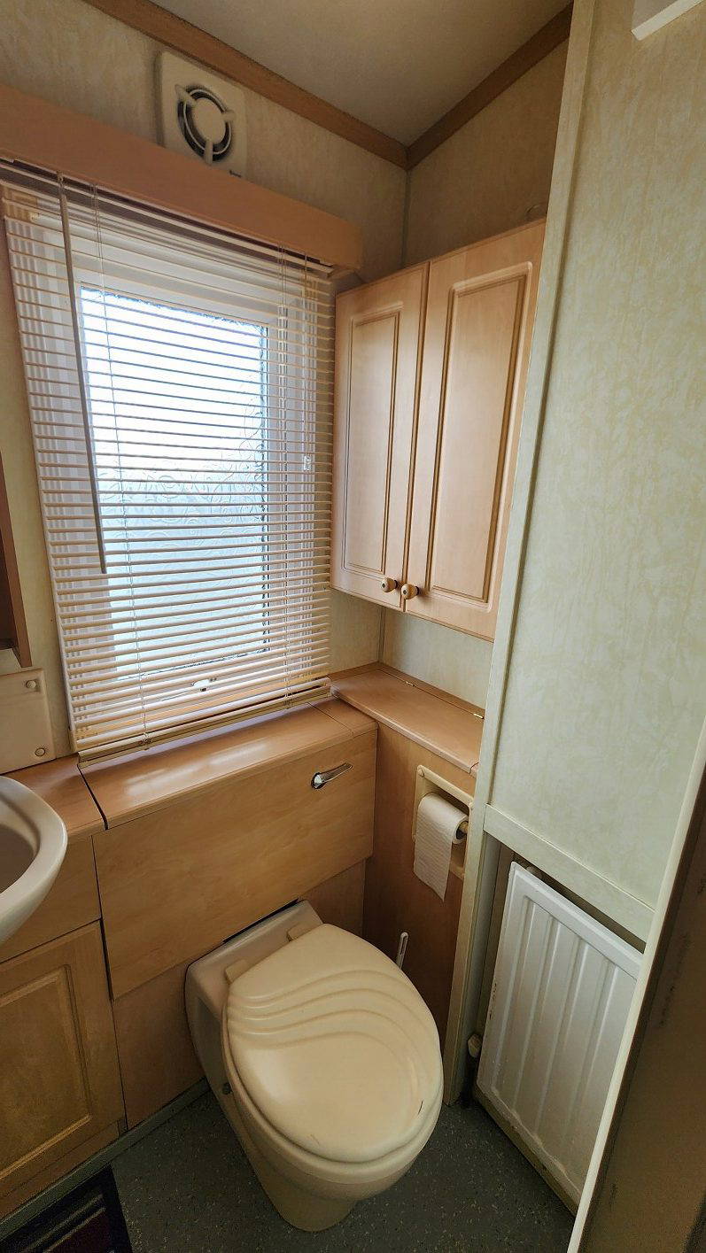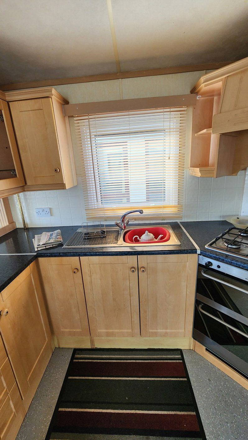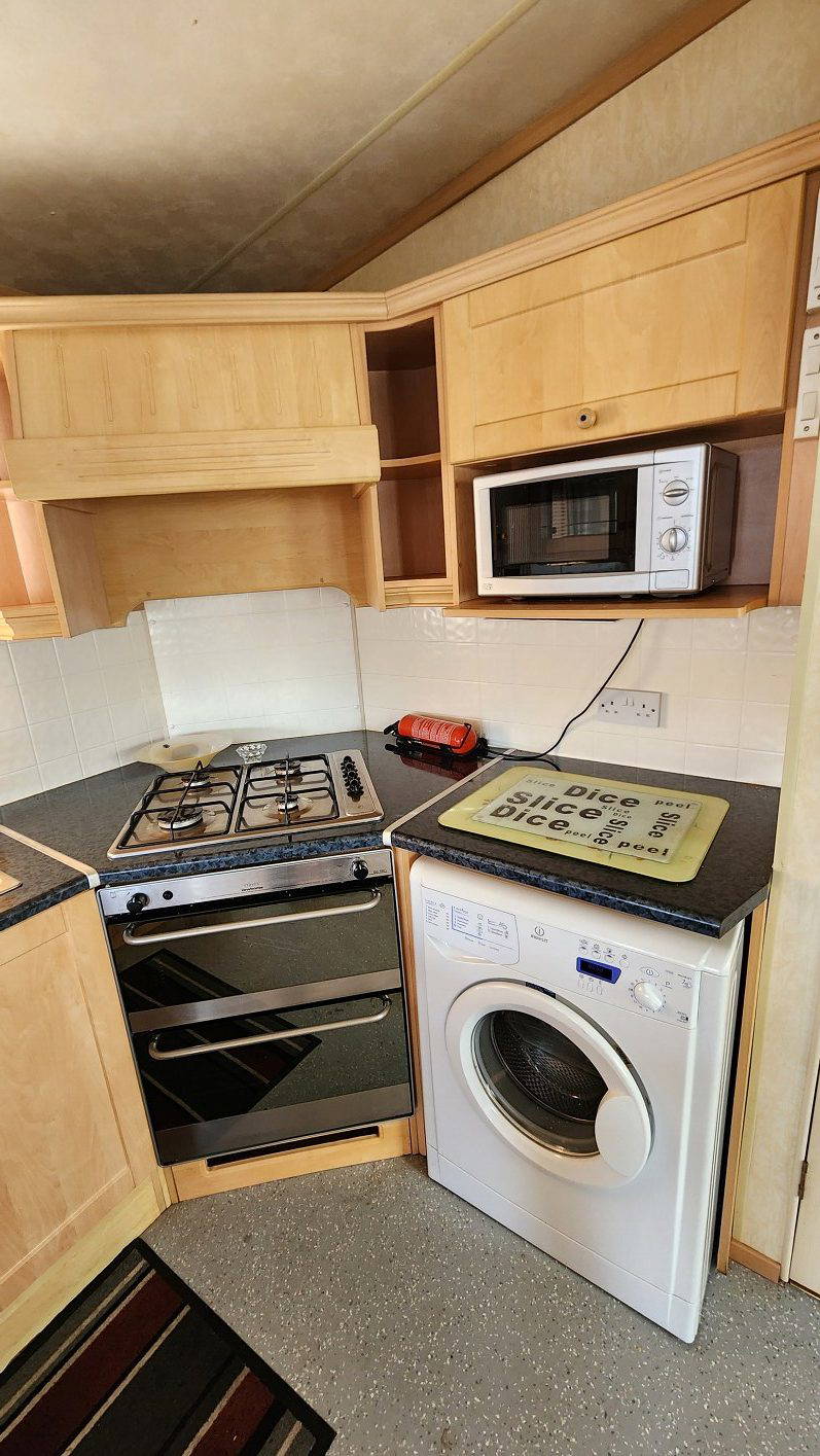 Willerby Aspen 35’x12′ two bedrooms. Master bedroom double bed with ensuite WC. Second bedroom with twin beds. WC and shower room. Double glazing and central heating. LPG water heater, cooker and lounge fire. Stock no.126